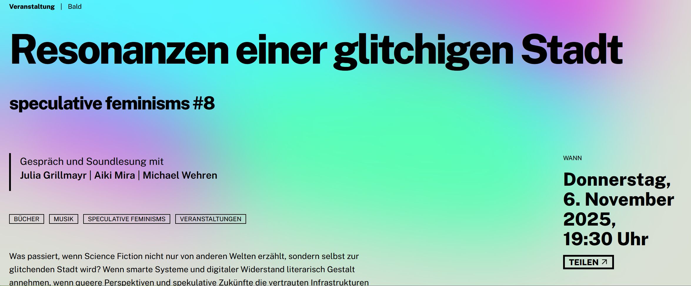 An diesem Abend liest Aiki Mira aus dem neuen Roman Denial of Service, in dem sich smarte Systeme und widerständige Imaginationen verschränken, während gleichzeitig Michael Wehren post-noise Soundscapes, den Glitch hörbar machen werden. Wo Fiktion auf Störung trifft, öffnet sich eine Stadt der Risse, Resonanzen und Reimaginationen. In einem anschließende Gespräch mit Julia Grillmayr werden wir über Science-Fiction als Versuchsanordnung für Zukunftsentwürfe jenseits linearer Fortschrittserzählungen sprechen.